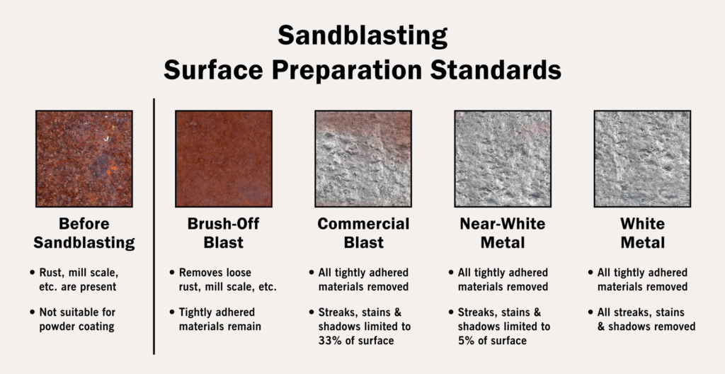 There are multiple sandblasting surface preparation standards to choose from. All of them will prepare your metal parts for powder coating by removing loose rust, mill scale, grease and other debris, as well as roughening the surface to ensure proper powder adhesion. Higher degrees of blasting will also remove more tightly adhered materials. This will increase coating life, but will also take longer and cost more, so a balance must be struck depending on your needs.